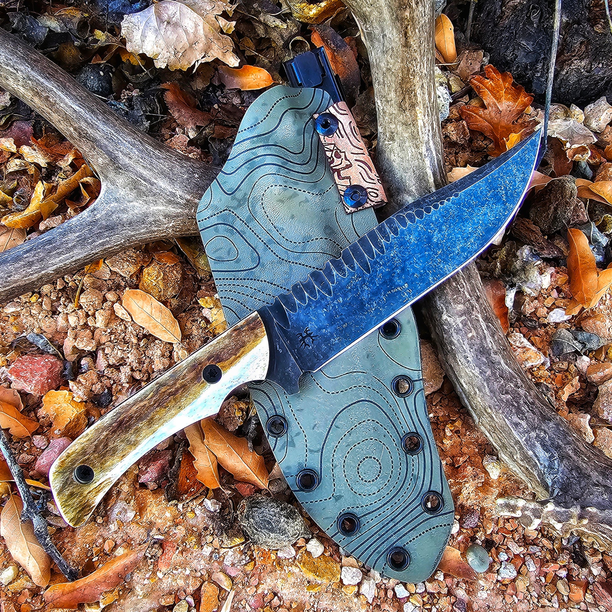 Blades will come with suede lined green topo kydex sheaths with Ulticlips